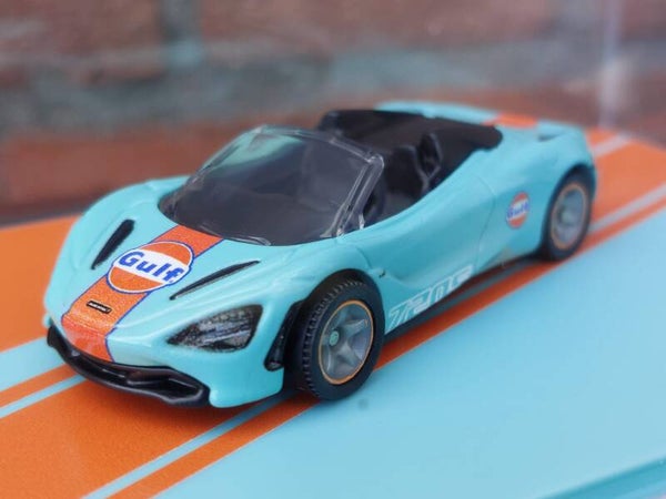 De McLaren 720S Spider is generaties lang verfijnd en is de verbluffende belichaming van snelheid, opwinding en aerodynamica. Ons 1:64 Matchbox Collectors-model bootst deze supercar na met een lichtblauwe satijnen afwerking en oranje accenten. We hebben hem zelfs een Gulf Racing-kleurstelling gegeven om het prestigieuze en productieve race-erfgoed van McLaren te weerspiegelen.